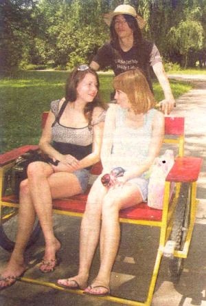 Рикша Антон Ященко везет студенток Алену Редчиц и Полину Лутченко