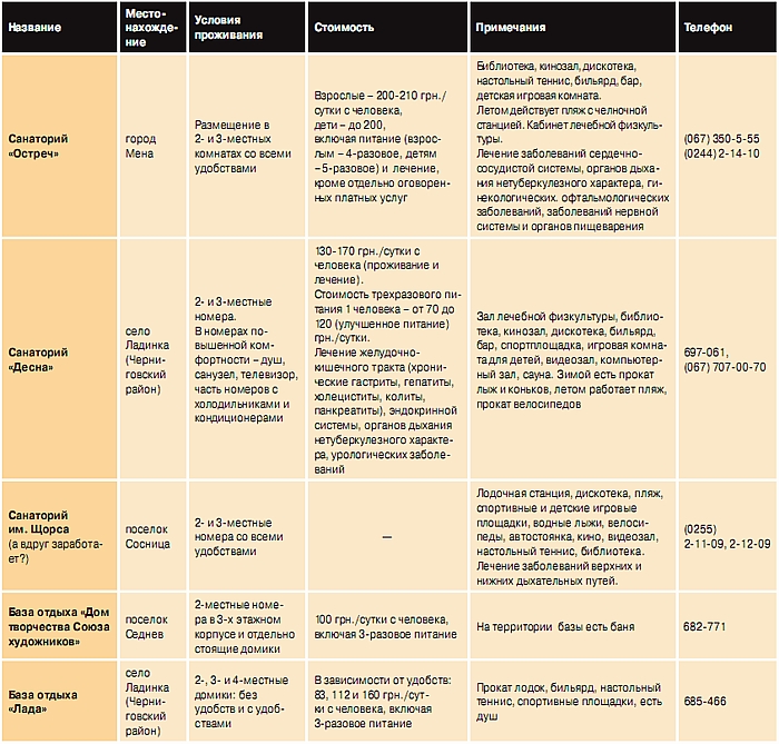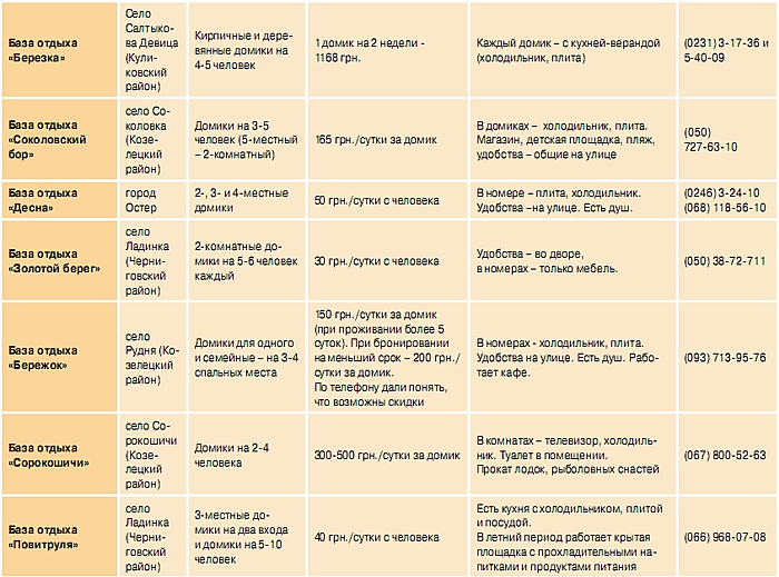 Базы отдыха, расположенные в Черниговской области, подсчитать весьма трудно. Во-первых, они постоянно меняют владельцев, все чаще становятся лишним грузом для предприятий и переходят в частную собственность или вовсе закрываются. Среди последних, например, популярная когда-то база «Ярославна» в Новгороде-Северском, которая на сегодня выставлена камвольно-суконной компанией «Чексил» на продажу. Те же, которые действуют, условно можно поделить на две группы: «советские», в которых минимум удобств и более-менее демократичные цены, и «современные», где сервис и стоимость заметно выше.