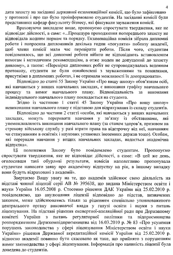 Касательно упомянутого студентами аннулирования лицензии от 8-го марта руководство УАБП заявляет в письме, что это решения Государственной аккредитационной комиссии Украины было принято с нарушением требований законодательства о лицензировании и может быть упразднено в соответствии с распоряжением Госкомпредпринимательства.