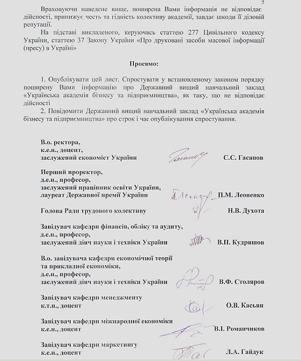 В письме, на 5 страниц руководство УАБП указывает автору статьи и редакции сайта об ответственности за публикацию письма от черниговских студентов 5-го курса и грозит обращениям в суд относительно возмещения морального вреда деньгами.