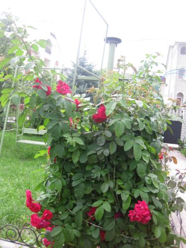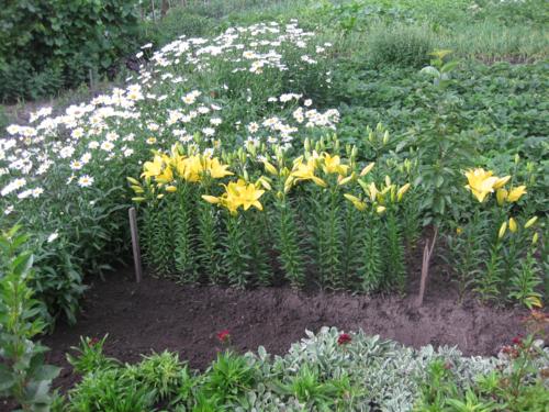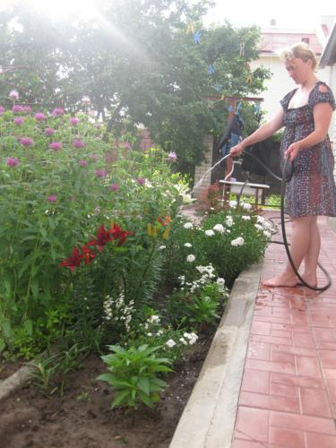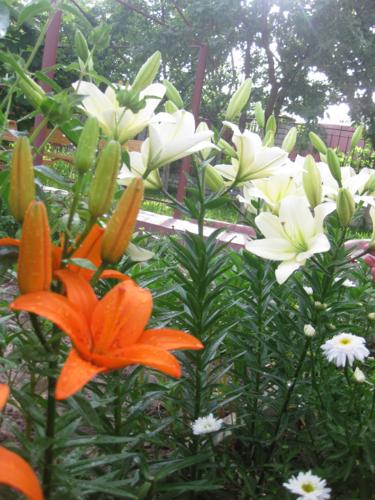 Много! Много цветов! Много зелени!! И чего здесь только нет!!! Это первое, что приходит в голову, чтобы описать словами ту красоту, которая окружает дом Елены Тимошенко! Признаюсь честно: сосчитать количество разновидностей всех растений мне просто не удалось. Судите сами: одних только лилий шесть сортов (розовая, белая, бордовая, оранжевая, желтая и желто-оранжевая), розы - на любой вкус и цвет (сортовые, карликовые, вьющиеся, красные и розовые самых разных оттенков), несколько сортов климатисов, гвоздик, гортензий, ромашек, а еще - канны, лаванда, флоксы, энотера, анютины глазки, петушки... Боюсь, что перечислить все-все-все просто невозможно! К сожалению и увидеть всю красоту в один день также нереально - например, пионы давно успели отцвести, а буйство гладиолусов, георгин, астр и хризантем - еще впереди. Скажу одно: гладиолусов, по словам хозяйки, около 50-ти сортов!