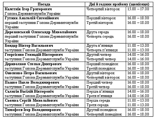 З 23.07.2010 року діє наступний Графік особистого прийому громадян керівництвом Державної митної служби України, затверджений наказом Держмитслужби України № 797.