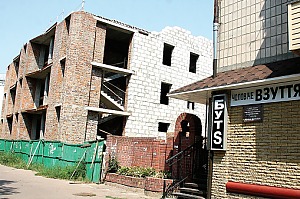Еще одна скандальная (когда-то) стройка «зависла» возле областной библиотеки им. В. Короленко. В свое время вокруг этой стройплощадки было сломано немало копий, но в противостоянии библиотеки и строителей выиграли последние. Однако уже более года недостроенное здание застыло на третьем этаже, уродуя собой центральную улицу города.