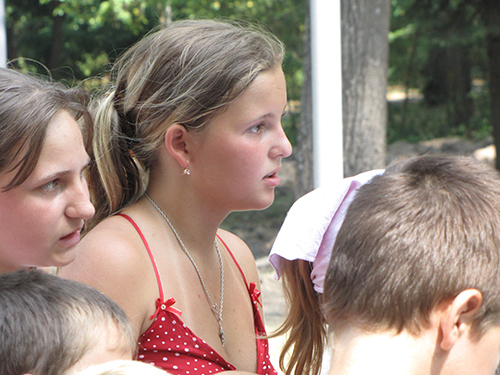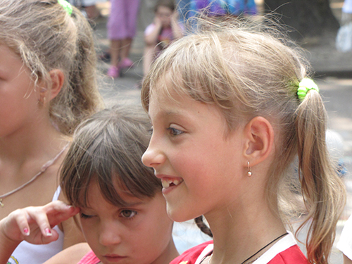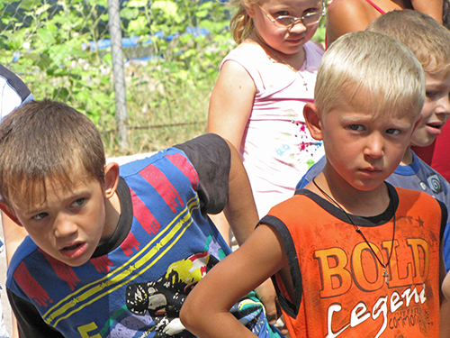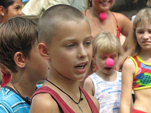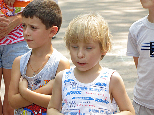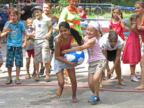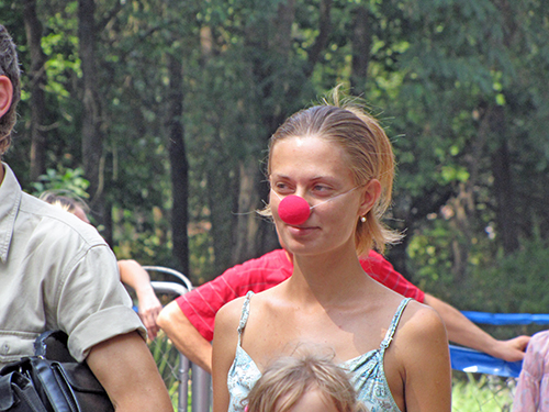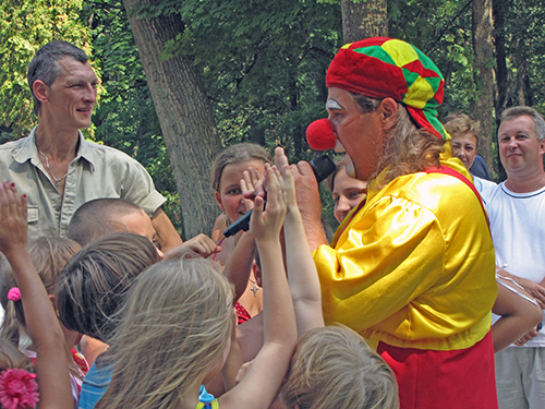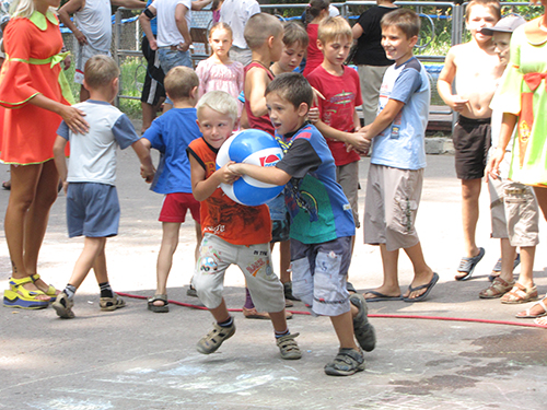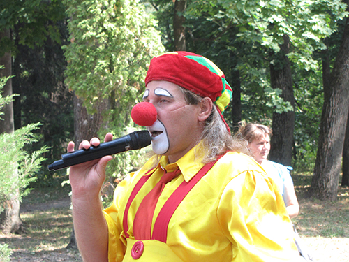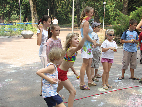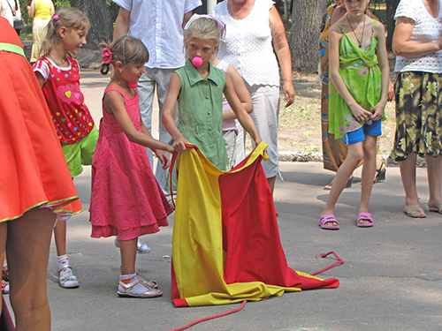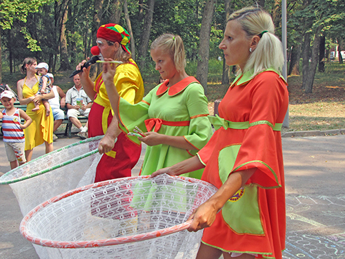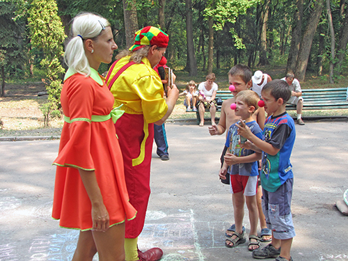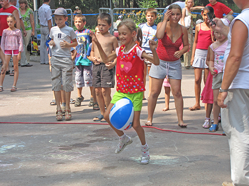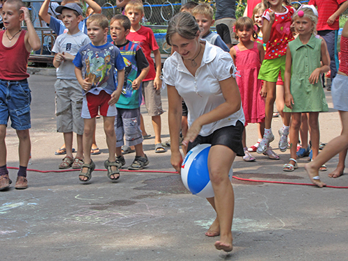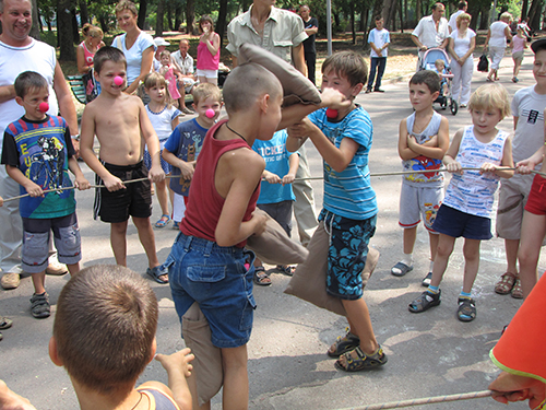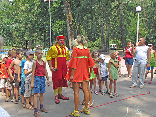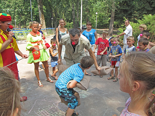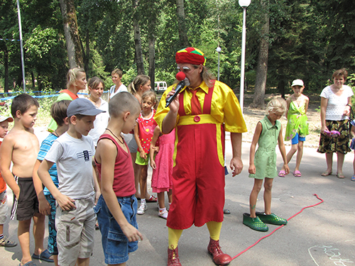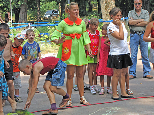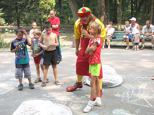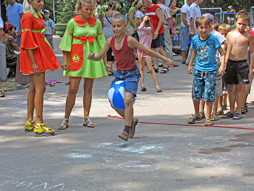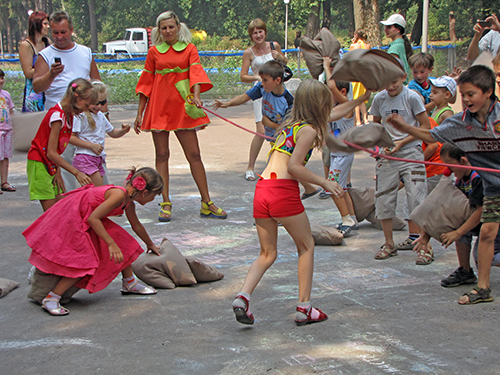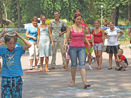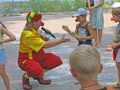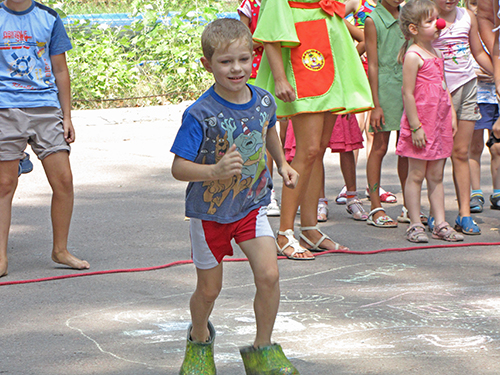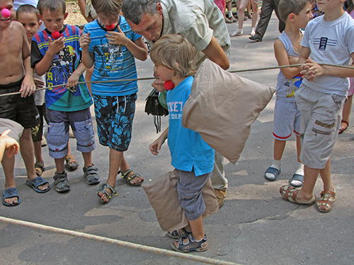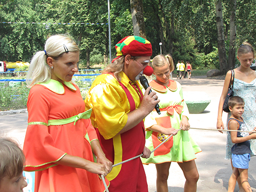 Соревновались в ловкости и скорости, меткости и сообразительности. Бегали в больших и неудобных калошах, скакали в мешках, метали стаканчики, дрались подушками. Веселые помощницы клоуна, поощряли участников призами. Смех и веселье царило на площадке. От накала этих веселых соревнований, день казался не таким уж и жарким.