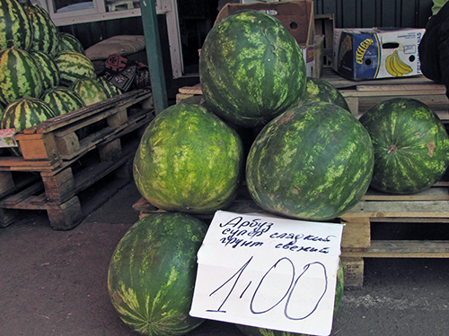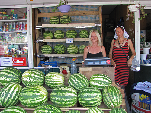 В торговых палатках по городу: арбузы – 1,70 грн/кг, дыни – 3,50 – 6,00 грн/кг. Выездной прицеп на площадке возле «Союза» за гостиницей Градецкий: арбузы – 1,50 грн/кг, дыни – 3,50 грн/кг.