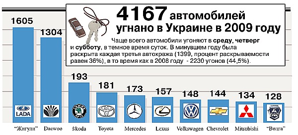 Как сообщили в ГАИ, чаще всего автомобили угоняют в среду, четверг и субботу в темное время суток. Самыми востребованными у угонщиков остаются ВАЗы. По итогам прошлого года в Украине было угнано 1605 «Жигулей», на втором месте – Daewoo (1304), далее с большим отрывом следуют škoda (193), Toyota (181), Mercedes (173), Lexus (157), Volkswagen (148), Chevrolet (144), Mitsubishi (134) и «Волга» (128).