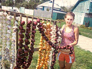— Мама плете, а я продаю,— говорить Наташа Мазько. — Сестра допомагає. А саджаємо і вирощуємо всі разом. Тут усе з городу, своє. Краще всього беруть синю цибулю. Іноді вінки на сувенір купують. Коли 20 вінків продамо за день, а коли й два всього. Краще торгівля йде в суботу і неділю, машин більше, люди нікуди не спішать. Часник крупніший беруть
