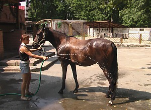 — Да, ухаживать за лошадьми сложно и это требует много денег. Спонсора у нас нету, зарабатываем сами. Я вообще-то работаю в библиотеке Короленко. Но основной доход, конечно, приносят сами лошади. Это и их прокат у фонтанов, и свадебные заказы. Вот в этом году у нас было свадеб четыре. Так что можно сказать, что лошади сами на себя зарабатывают. Очень много денег уходит на витамины, в начале лета я их закупила на 4 000 грн. (мы используем витамины, которые нужно вкалывать, а «кормящим мамам» подмешиваем в еду). Что касается самого ухода за лошадьми, то в этом мне помогают Наташа и Миша.