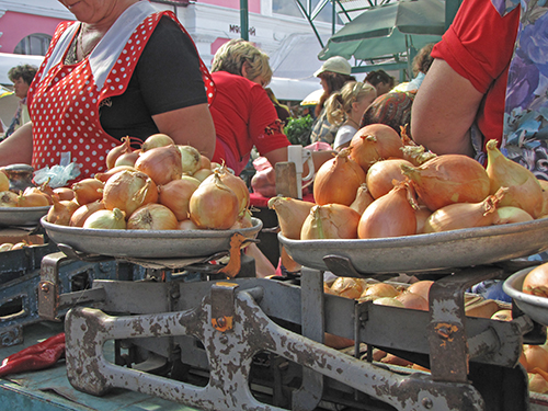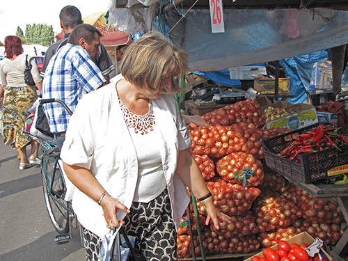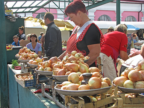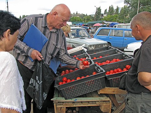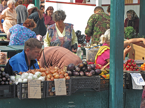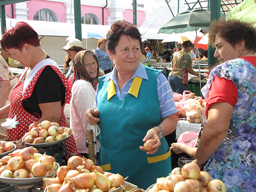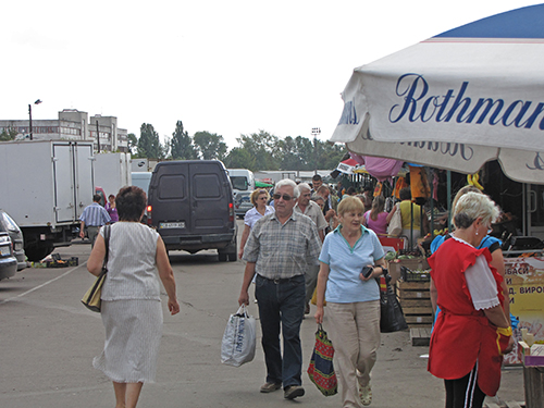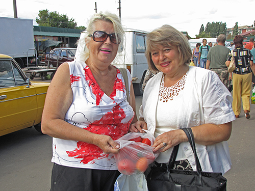Возле палатки с овощами две покупательницы тщательно отбирают помидоры. Знакомлюсь, пенсионерки Нина и Татьяна. Они пожаловались: “Ужас, за последние две недели цены выросли в два раза. Запасы на зиму делать надо, да и сейчас покушать овощей хочется. Лук две недели назад был — 2,60 грн./кг., а сейчас — 4,50, во всем виноваты наши политики, если бы отделить политику от экономики, а так они наживаются за наш счет”.