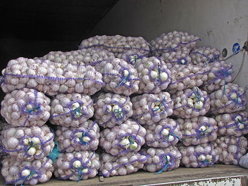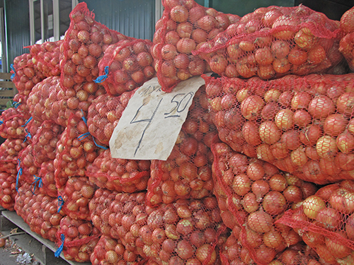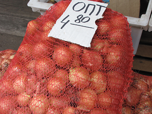 На прилавках большое количество лука, который продают расфасованным по сеткам и на развес.