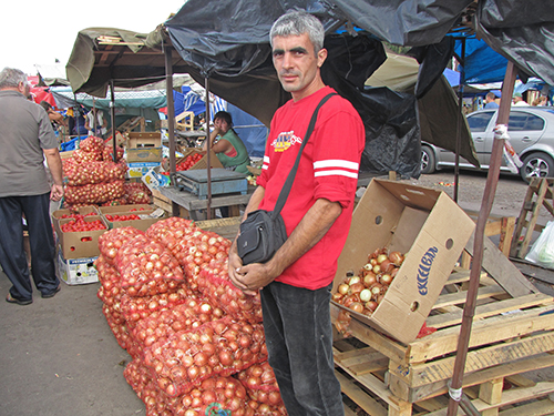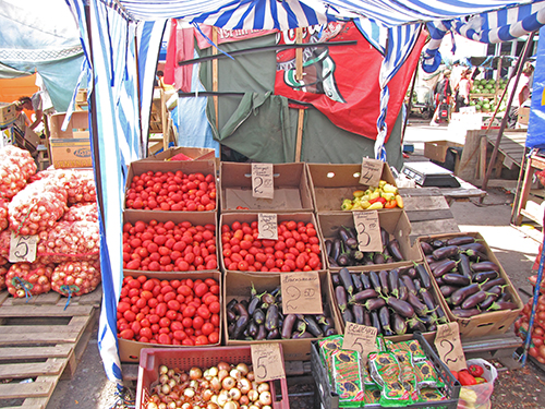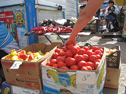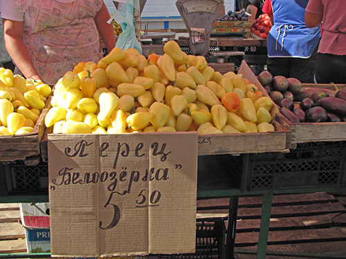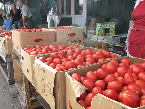 На Центральном рынке все овощи дороже. Перец сладкий “Белозерка” - 5,50 грн/кг. Лук — 6-7 грн/кг. Продавец Надежда торгует местными помидорами: “ Помидоры наши есть, и хорошие. Вот мы же берем наши. Но импорт перебивает. Люди, при нынешней обстановке безденежья, берут подешевле”.