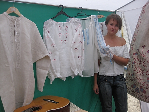 Вишивальниця Ольга Костюченко зі своїми роботами (чоловіча сорочка – 1100 гривень, жіночі блузи – 2 500, 550).