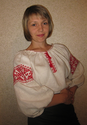 Як ви вже, мабуть, і здогадались – вишиванка моя готова. Наскільки гарна і стильна – судити вам. Що ж стосовно правильності, то «погрішності» деякі є, але, як запевняє мій вчитель Ольга Костюченко, для пересічного громадянина вони залишаться непоміченими. В цілому ж – все, як треба: червоні ромби з елементами квітів по білому полотну, біла мережка, вставні рукави, характерне для вишиванки оформлення горловини. До речі, саме останнє – оформлення горловини – було для мене найважчим. Але не думаю, що всім буде цікаво читати подробиці пошиття вишиванки. Хоча... Кому все ж таки цікаво, той може і собі звернутися за допомогою до Олі, тим більше, що нагода така передбачається: вже восени в «Арт-клубі» вишивальниця розпочне свої уроки вишивальницького ремесла, до яких можуть приєднатися усі бажаючі.