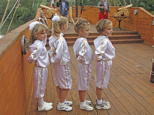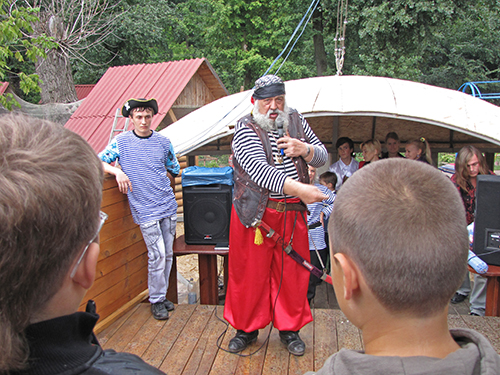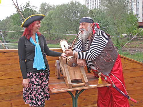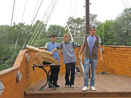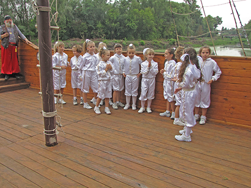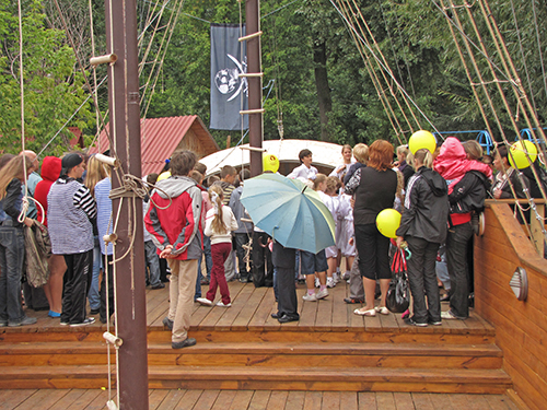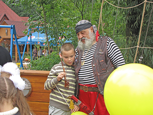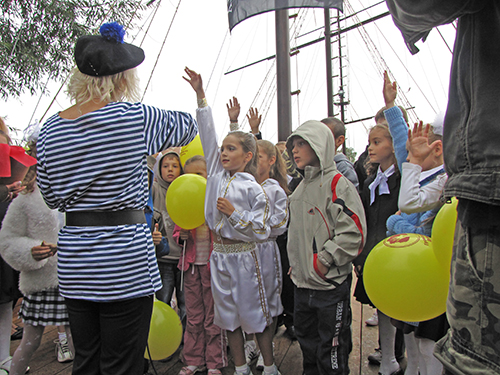 А на корабле детвору встречала команда во главе с боцманом и его веселым помощником. Боцман курил настоящую трубку, и на боку его висела настоящая сабля. Поздравили всех с Днем знаний капитан и боцман. А затем, вместе с веселым помощником боцмана дети участвовали в аттракционах, отгадывали загадки, получали призы. В честь праздника на корабле палили пушки, а дети, сойдя на берег, искали сокровища, которые где-то спрятали пираты.