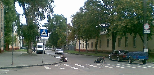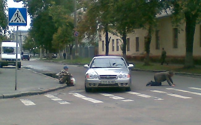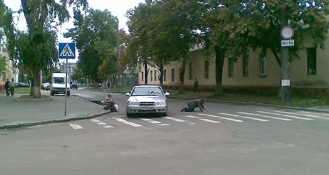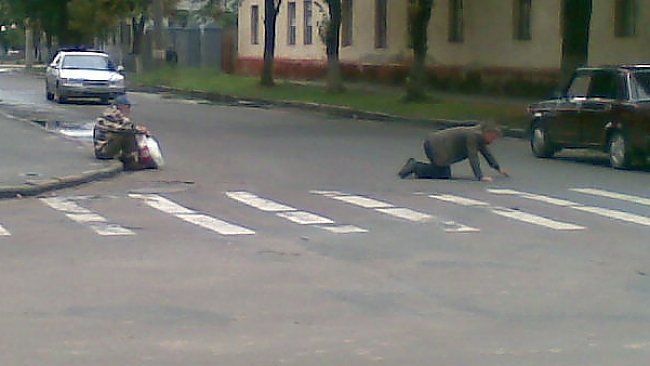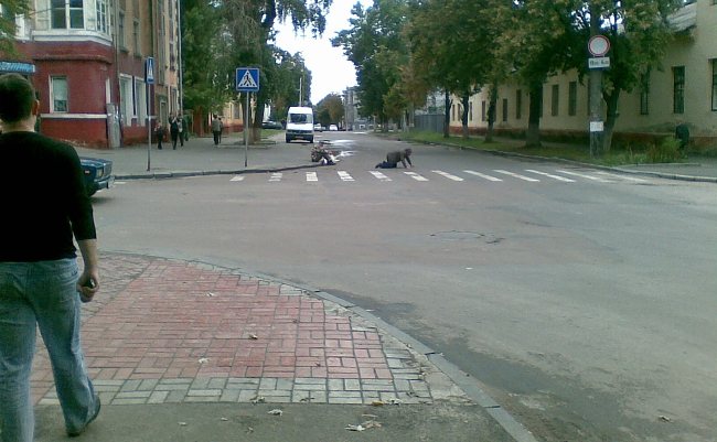 2-го сентября, в 13.15 на перекрёстке улиц Кирпоноса и Святониколаевской наблюдала удивительную картину. Два нетрезвых пешехода, видимо после какого-то знаменательного события пытались добраться домой. Причем один из них отчаялся перейти улицу с автомобильным движением, другой же напротив, так стремился к поставленной цели, что решил: пусть не на двух, так на четвереньках перейду дорогу!