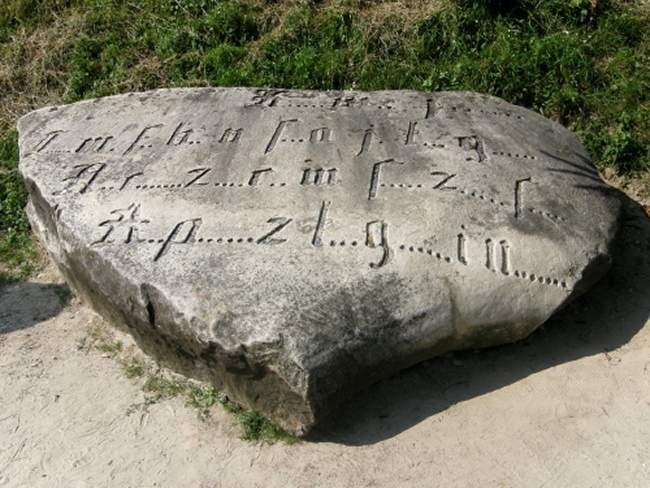 Эти камни - все что осталось от разрушенного в 16 веке Новосилковского замка, построенного выходцами из Венгрии, потомками рыцарей ордена тамплиеров. Может быть, текст на камне указывает где спрятаны несметные сокровища тамплиеров?