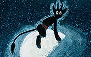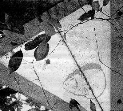 Возле дороги у дома — старая вишня. В ней запутался дорожный знак. Сразу и не заметишь. Оттягиваем ветки. С белого знака на нас смотрит какое-то существо. Широкий лоб. Раскосые глаза. Открытый рот — изображенный словно кричит. И немножко на Ленина похож.