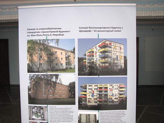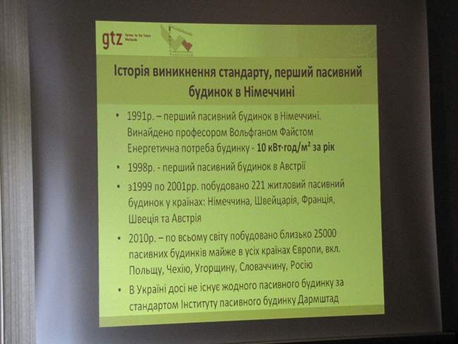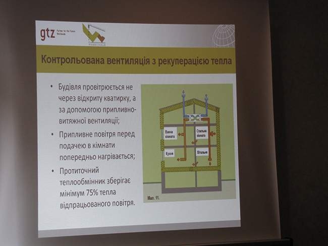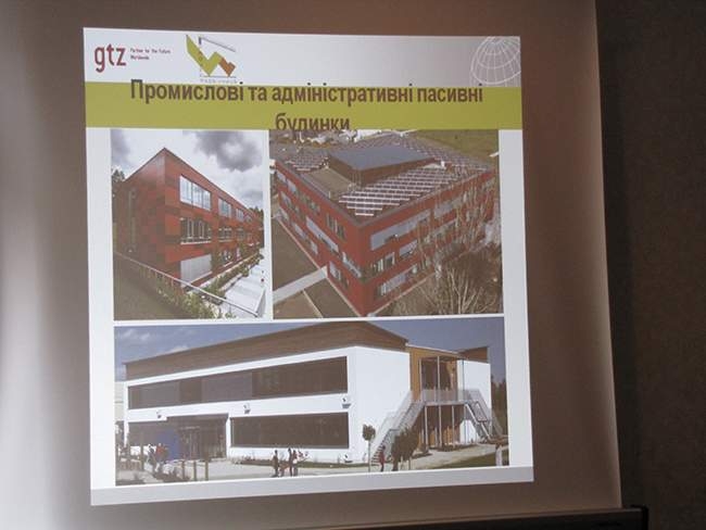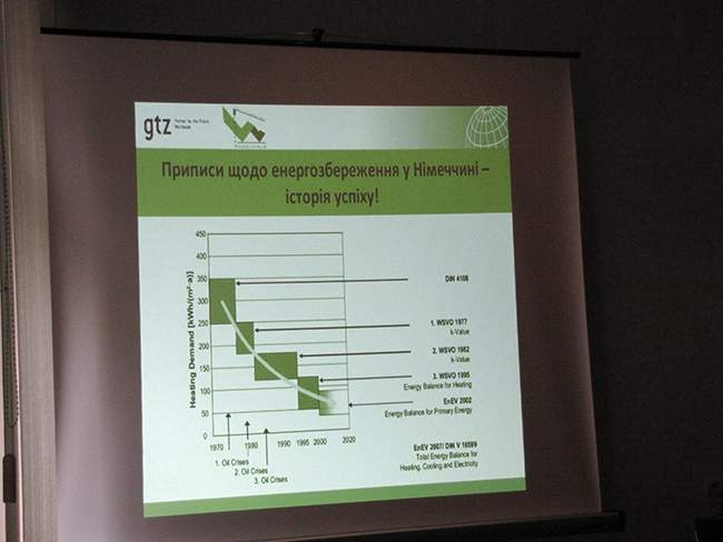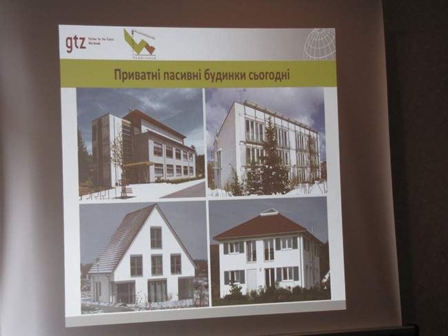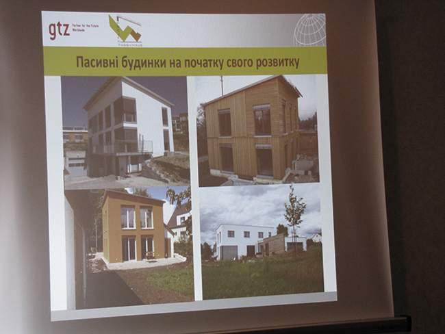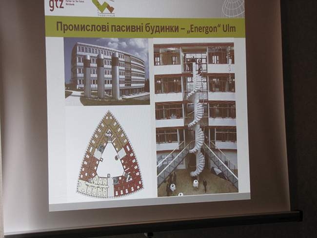 Далі, технічний консультант проекту Німецького товариства технічного співробітництва (GTZ) Андреаса Грунер, розповів про енергоефективне будівництво. Розповідь супроводжувалась показом слайдів. Він торкнувсь таких технологій як: скорочення споживання енергії, пасивне залучення енергії з внутрішніх джерел тепла, теплоізоляція, герметичність, використання відновлюваної енергії та інше.
