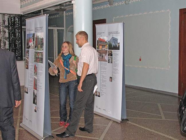 Потім присутні оглянули виставку, на якій окрім інформаційних стендів з детальним описом технології будівництва, а також прикладами реалізованих проектів різноманітного цільового призначення, представлені деякі експонати з макетами стін пасивного будинку, оригінальна вентиляційна техніка з рекуперацією тепла, тощо.