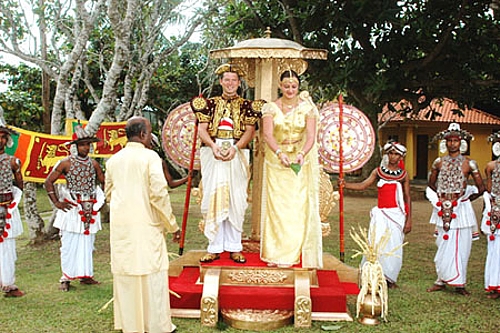 Шри-Ланка - страна ярких красок и образов. Среди тропической зелени и благоухающих цветов происходит обряд бракосочетания. Вся церемония проводится с соблюдением местных традиций и ритуалов, в национальных костюмах и при участии слонов. Молодых одевают в традиционные ланкийские наряды. Жених и невеста, с красивым букетом из экзотических цветов, в сопровождении мини-процессии, проходят из номера к месту церемонии. Весь путь сопровождается песнопениями девушек и традиционными национальными танцами юношей под звуки барабанов. Церемония проходит на специальном помосте - «Порува», который украшен белым или розовым лотосом и декорирован в национальном стиле. Стоимость этой церемонии - 1419 дол.