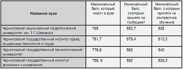 Если судить по максимальному баллу, с которым в этом году пришли студенты в черниговские вузы, то самым престижным на сегодняшний день является Черниговский национальный педагогический университет им. Т. Г. Шевченко. 785 баллов «осели» на филологическом факультете ЧНПУ на специальности «Английский язык». Такого балла нет ни в Черниговском государственном институте права, социальных технологий и труда, ни в Черниговском государственном технологическом университете, ни в Черниговском государственном институте экономики и управления, которые могут похвастаться лишь баллами, соответственно, в 781,7 – 778,8 – 759, 9.