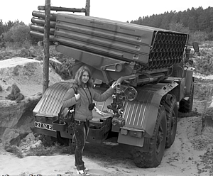 Журналистка Ульяна Ковальчук возле реактивной системы залпового огня «Град», которую солдаты ласково называют «неуправляемые трубы»