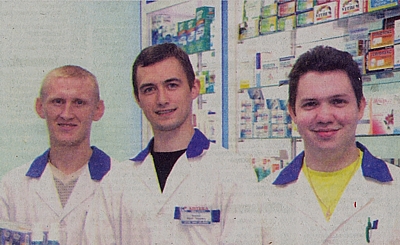 Администратор зала Олег Бондаренко, зав. аптекой Юрий Чаленко и провизор Юрий Иващенко