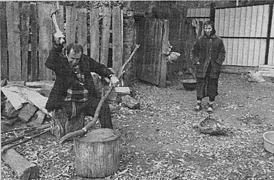 Дрова чоловікові рубати важко. Але ж пристосувався робити це, сидячи на пеньку. Хоча й удар не той. Гілку, яку б здоровий чоловік перебив за пару ударів, Бондаренко цюкає разів п'ять.