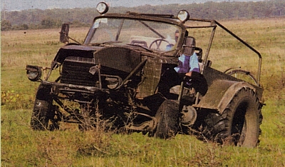 Поставили шматок кабіни від ГАЗ-53, два сидіння від «Москвича», біля заднього мосту прилаштували бак від «Ниви». За сидіннями зробили дерев'яний кузов. У ньому — заднє сидіння від УАЗа. Над кабіною й кузовом встановили дуги. На них натягується тент.