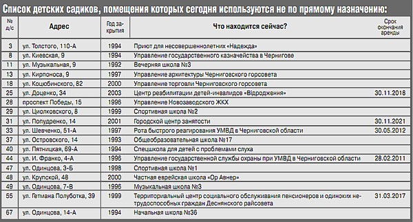 Таким образом, сегодня в Чернигове «по специальности» работает лишь 54 дошкольных учреждения, находящихся в ведении управления образования. Остальные – в аренде и по-прежнему находятся в коммунальной собственности, но оказались на сегодня в «подвисшем» состоянии.