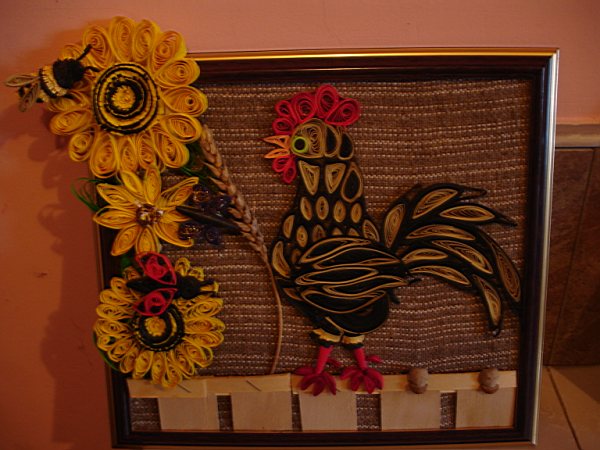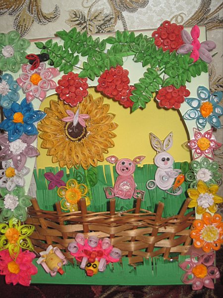 Делать поделки меня научила моя бабушка. Скручиваю полоски нарезанной бумаги и составляю из того что получилось все, что необходимо для сюжета картины.