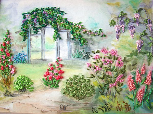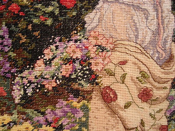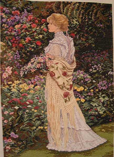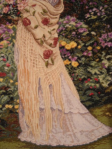 Моя самая интересная и сложная работа «В ее саду». Здесь используется несколько техник: крест, полукрест, бэкстич, французские узелки на букете и кординг на шали