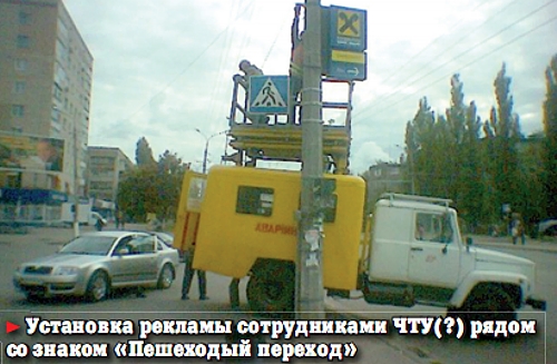 Установка рекламы около магазина «Турист». Причем реклама очень похожа на дорожный знак и установлена рядом с дорожным знаком. Кстати, как нам уточнили, установку проводили именно сотрудники ЧТУ!