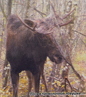 Кто-то из моих спутников заметил: «Похоже на хмель». Но разве хмель для лося преграда? Из него он бы легко выпутался. Мы подошли ближе. Это был достаточно крупный самец, лет пяти, а его рога (с одной стороны четыре отростка, с другой — три) опутаны клубком провода, который зацепился за молодые деревья. Видимо, бедолага так крутился, что «свил» плотный канат, который и не отпускал его. Лось был весь мокрый, потому что накануне прошел дождь. Вокруг него — сильно вытоптанное место. По всему было видно, что сохатый промучился там, может, сутки, а то и двое.