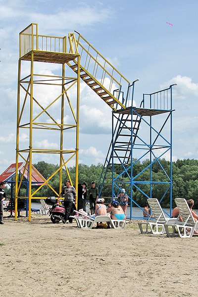 К вышке обещали еще и бассейн для детей, и наверно она должна была быть как-то огорожена, пока полностью не сдана в эксплуатацию, но естественно ни бассейна, ни ограды там никто не установил. И так простояла она еще больше года. Летом мамочки зорко следили за тем, чтобы детвора ни дай бог не влезла и не попадала оттуда, а взрослые развешивали на ней мокрые футболки и шорты после купания.