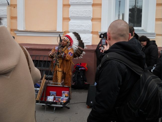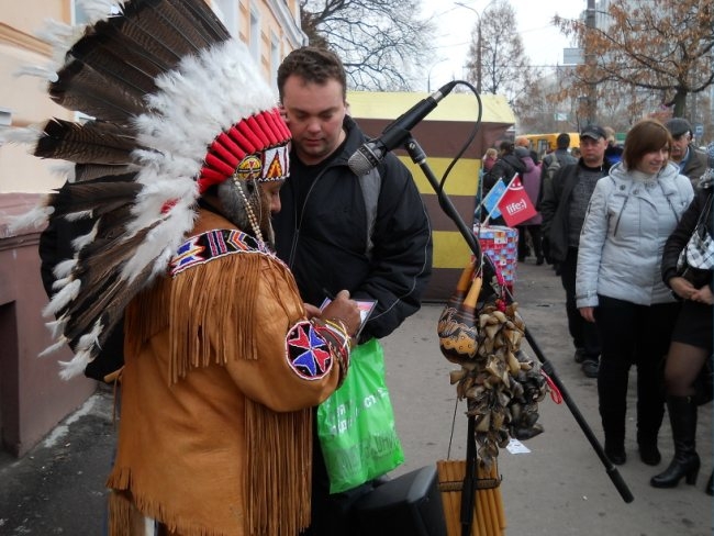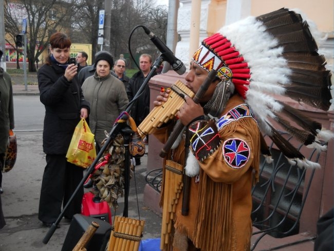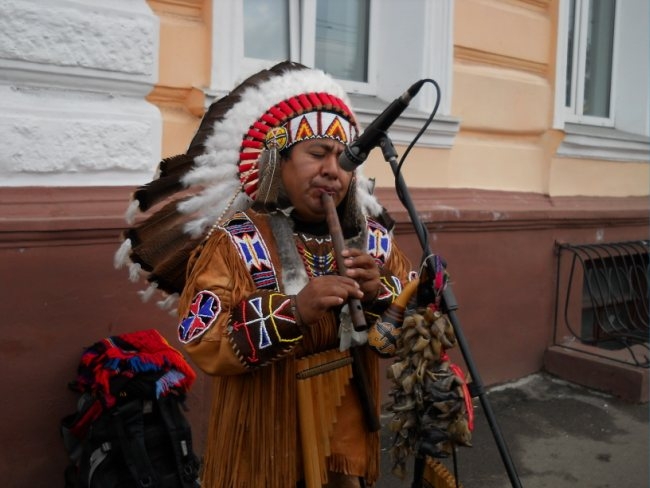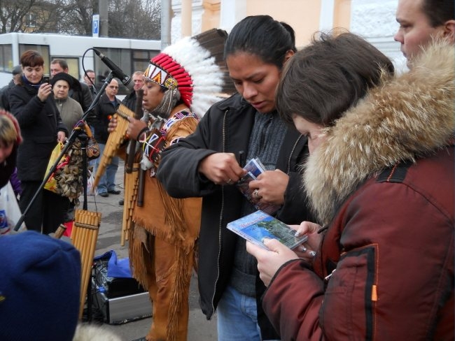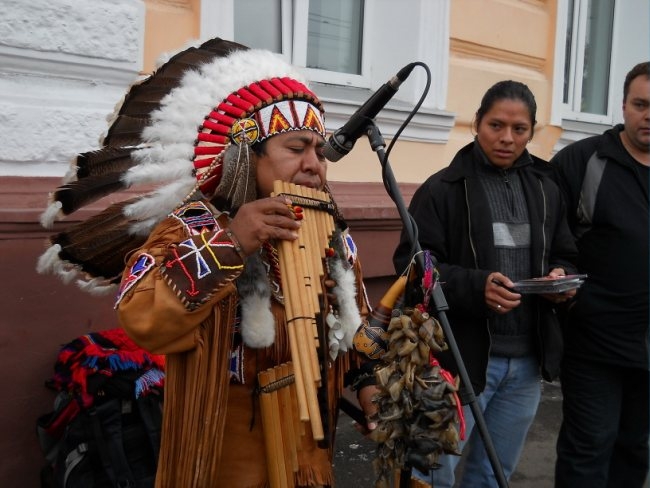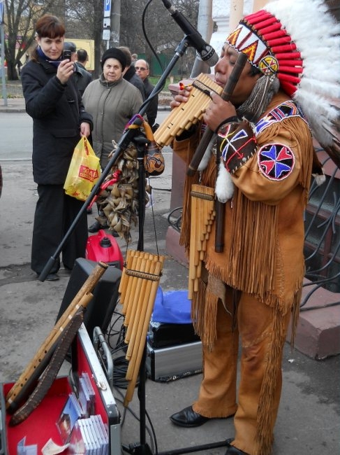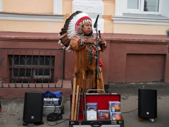 Один, в костюме индейского вождя, на флейтах различного калибра исполнял красивые мелодии. Другой – довольно успешно продавал с этими мелодиями диски. Попутно, оба успевали и автографы раздавать и позировать для жителей города, которые обступили диковинных артистов с мобильными телефонами.