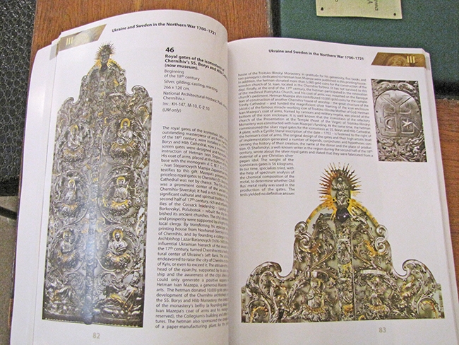 На виставці було представлено понад 100 унікальних пам’яток, які належать 27 інституціям (музеям, архівам, бібліотекам та приватним колекціонерам) України, Швеції та США. На міжнародній виставці експонувалася і перлина фондової колекції Національного архітектурно-історичного заповідника «Чернігів стародавній» – срібні царські врата з Борисоглібського собору.