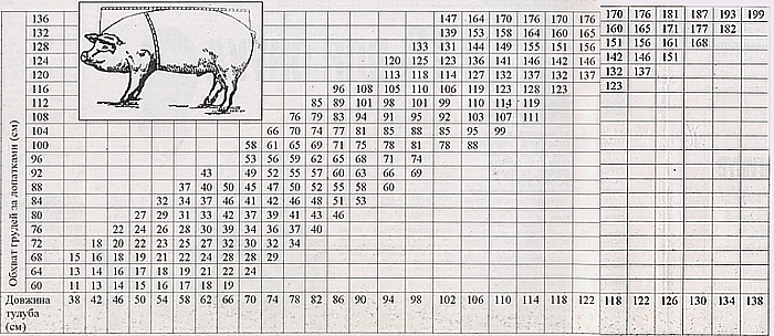 У спеціальній таблиці знаходять точку перетину двох промірів. Вона і покаже приблизну вагу тварини (див. таблиці 1.2).