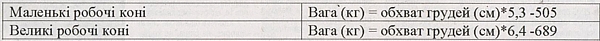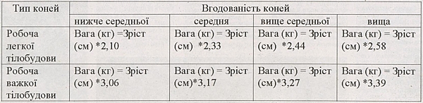 Вага коня визначається двома способами (найкраще підходить для робочих коней) (див. таблиці 3 та 4). У першому випадку потрібен обхват грудей коня. Точність визначення ваги — плюс-мінус вісімнадцять кілограмів. У другому випадку потрібен зріст коня. Ця методика недосконала. Так визначали вагу коня в 50-х роках минулого століття, — наголосив спеціаліст.