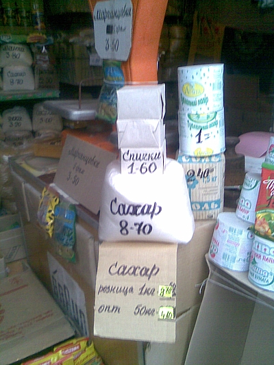 О ценах: факты налицо каждый день, так что сообщения Управления статистики о якобы неинфляции – пустой звук! Еще два дня назад в этом же месте сахар стоил 8,50 грн., а еще несколько дней назад – 8,20 грн., дальше даже не беру, когда еще не так давно он был по 7,70 -7,80 грн. Это не говоря уж о подсолнечном, для подорожания которого тоже причин не было, а за последний месяц оно прыгнуло минимум на 2,50 грн./л! Хлеб тоже за последние дни прыгнул до 3-х грн. (кстати, в то время, как при цене на хлебопекарне в 2.88 хлеб в некоторых ларьках он стоил 3,20, а сейчас сколько будет стоить?). И это только три продукта из основных! Может, продолжим перечень?..