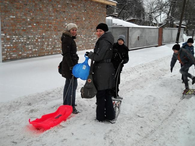 Пока ехали, в салон троллейбуса энергично протиснулись две веселые жизнерадостные компании. Мужчины с лыжами наперевес, и молодые симпатичные мамы, сопровождающие любимых чад на саночную прогулку.