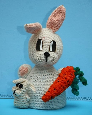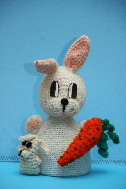 - Берем пустую пластиковую бутылку, обрезаем у этой бутылки горлышко так, чтобы у горлышка оставалась небольшая юбочка. Затем нижнюю часть бутылки выбрасываем, а горлышко с «юбочкой» и будет основой нашей будущей игрушки. Далее начинаем с того, что с помощью крючка и ниток нужного цвета обвязываем основание горлышка, и добавляя с каждым новым рядочком по несколько столбиков, обвязываем таким образом всю бутылку. Снизу вязаную юбочку стягиваем. После этого «придумываем» зверюшке голову (тоже вяжем и затем начиняем поролоном), пришиваем ушки, ротик, глазки и все необходимое – главное, подключаем фантазию. Таким образом можно смастерить все, что угодно! Но поскольку у нас грядет год Кролика, Зайки или Кота, то на сегодняшний день актуальнее всего будет сделать именно этих зверят. Какими они будут? Придумывать вам.