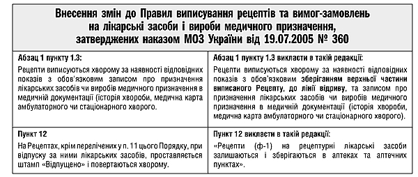 Теперь в обязательном порядке рецепт выписывается в двух экземплярах, один из которых, с подписью врача и печатью лечебного учреждения, остается у больного. Провизоры должны будут хранить эти бланки на протяжении квартала, что даст возможность проверить их, если в течение этого времени возникнут какие-то проблемы. После этого срока экземпляры рецептов, хранящиеся в аптеках, уничтожаются.