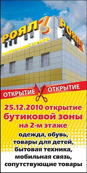 В ближайшую субботу - 25 декабря – «Рояль» вновь приглашает жителей и гостей нашего города на празднование: здесь отроется второй этаж со множеством маленьких и больших магазинов. В ассортименте товаров