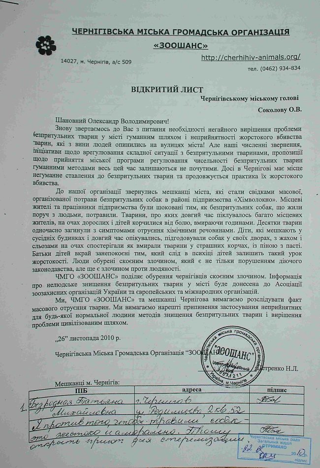Свое отношение к уничтожению животных подобным бесчеловечным и незаконным методом организация «ЗООШАНС» и сто шестьдесят шесть жителей микрорайона «Химволокно» выразили в открытом письме к городским властям, потребовав найти преступника-живодера.