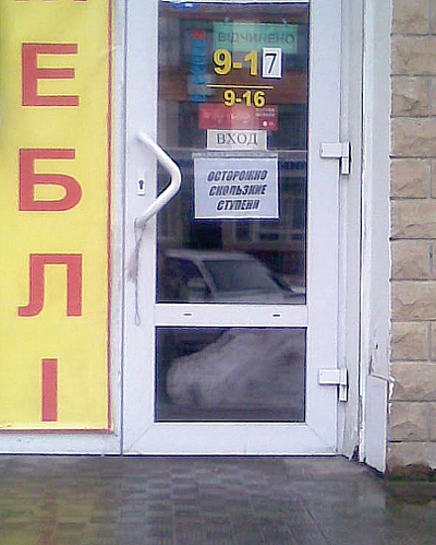О ступеньках: вот такая предупредительная надпись на дверях некоторых магазинов. Это типа снимают с себя ответственность? Если кто-то навернется, то сам дурак? Спрашивается: зачем изначально делать ТАКИЕ ступени? Во-вторых, а шипованный коврик уж в таком случае положить слабо?
