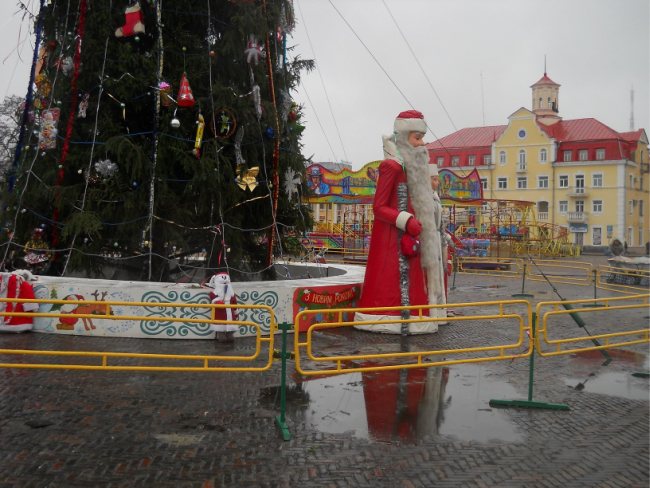 Плюс лужа почти под ногами сказочных новогодних персонажей у главной городской елки.