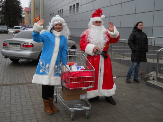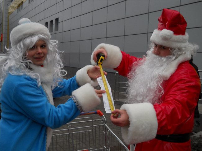 В другом районе города - живые Дед Мороз со Снегурочкой. Оба симпатичные, жизнерадостные. Возле огромного, недавно открывшегося супермаркета, сантиметром измеряют длину чеков за покупки, у вышедших наружу покупателей. В зависимости от длины - количество призовых пирожных. Бесплатно! Мне достались два. Свежие, вкусные.