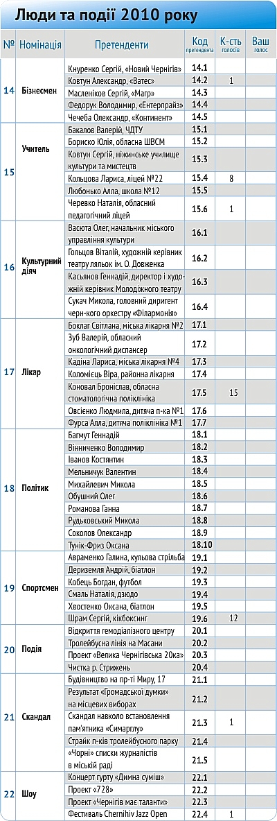 1) заповнити анкету, поставивши відмітку в клітинці «Ваш голос» за найкращого, на вашу думку, номінанта. Відправити або занести анкету до редакції газети «Семь дней» за адресою: вул. Щорса, 12, оф. 76 з приміткою «Наше місто». Анкети приймаються до 25 лютого 2011 р.;
