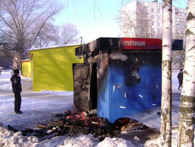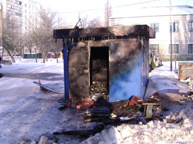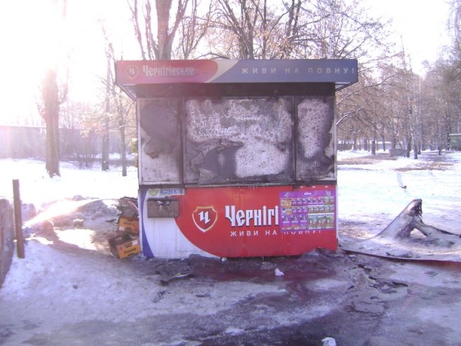 Сьогодні вночі згорів продовольчий кіоск на Шерстянці, біля підземного переходу. Вдень біля згорілого кіоску були помічені місцеві п’яниці-мародери, які витягували звідти напівобгорілі продукти та пляшки.